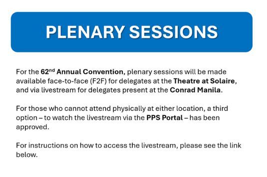 The 62nd Annual Convention may be experienced in different ways. Plenaries will be available Face-to-Face at the Theatre at Solaire, and available via livestream for registrants physically present at the Conrad Manila and through the PPS Portal.